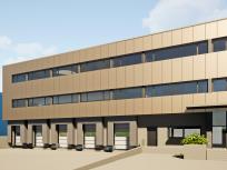 Die Verladerampen werden vor Ort geschalt. Die Treppenhauswände des Bürogebäudes werden teilweise in Sichtbeton ausgeführt, des Weiteren wird die Betonoptik der Fertigteiltreppen sichtbar bleiben.